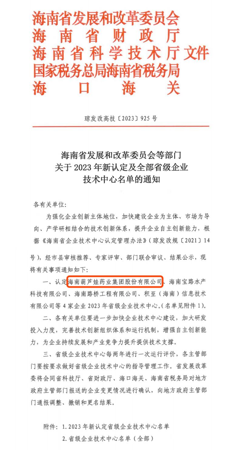 近日,海南省发改委等多部门联合公布了《关于2023年新认定及全部省级企业技术中心名单的通知》,其中,海南6008集团药业集团股份有限公司成功通过评审,被认定为省级企业技术中心,是本次获批的4家企业之一。